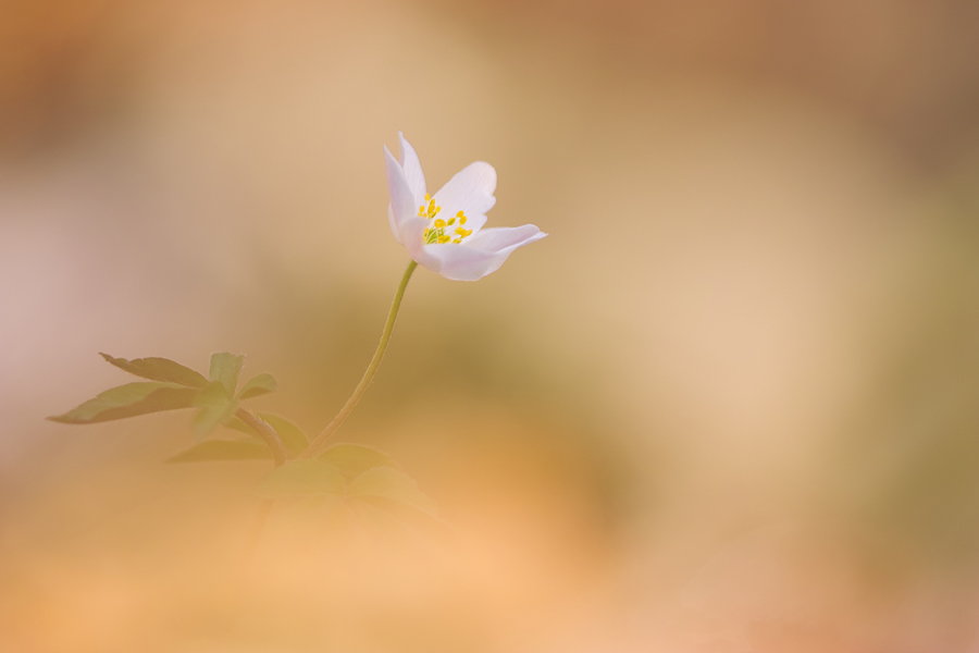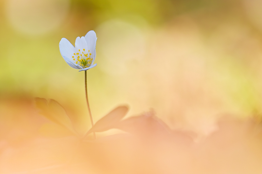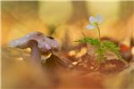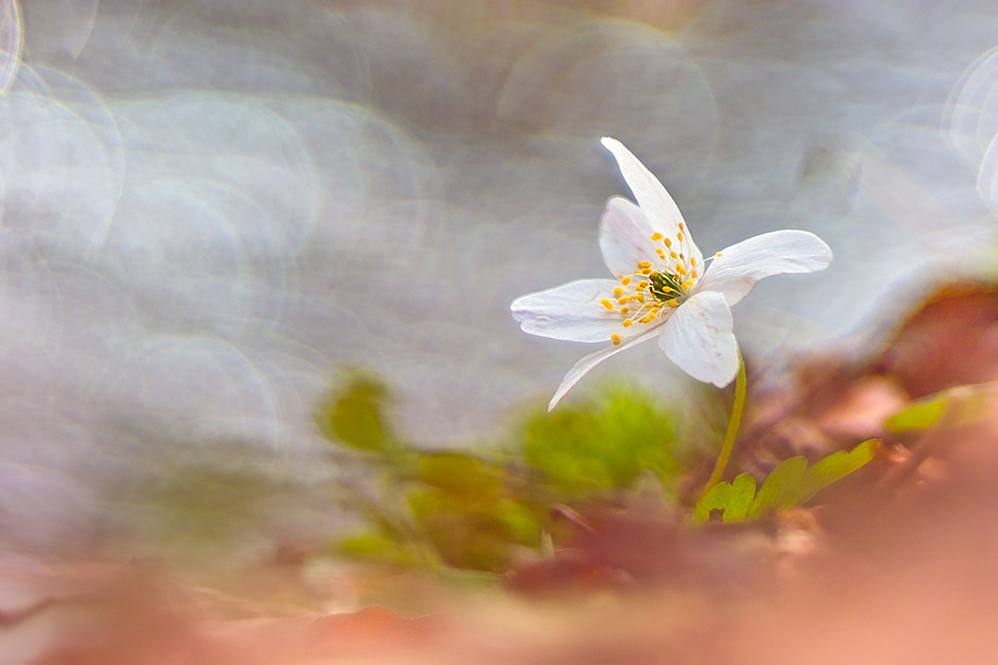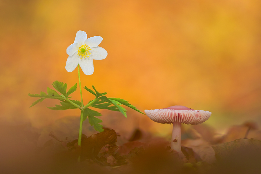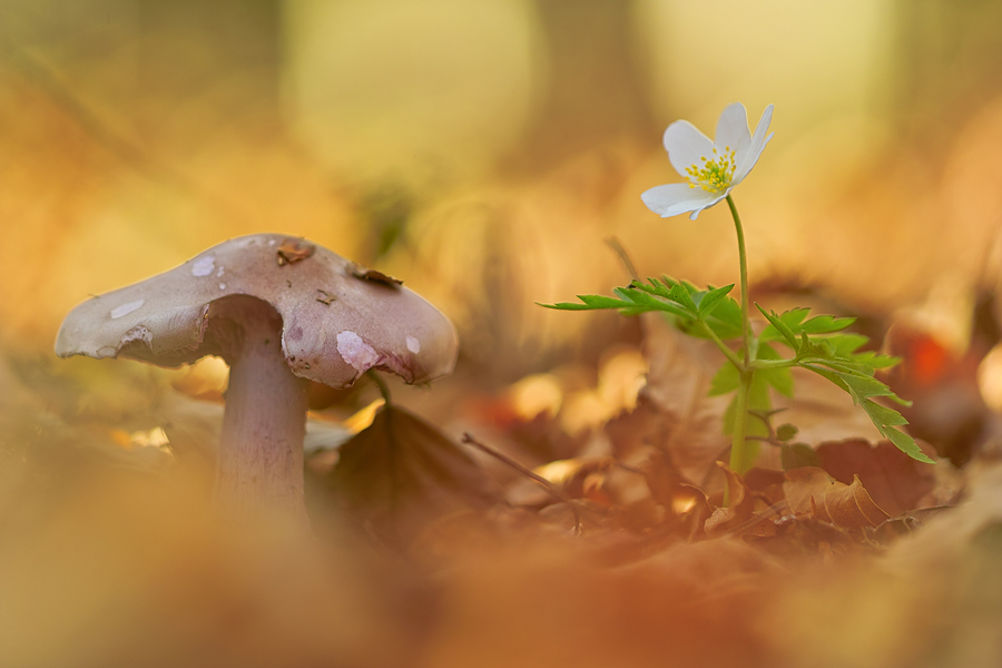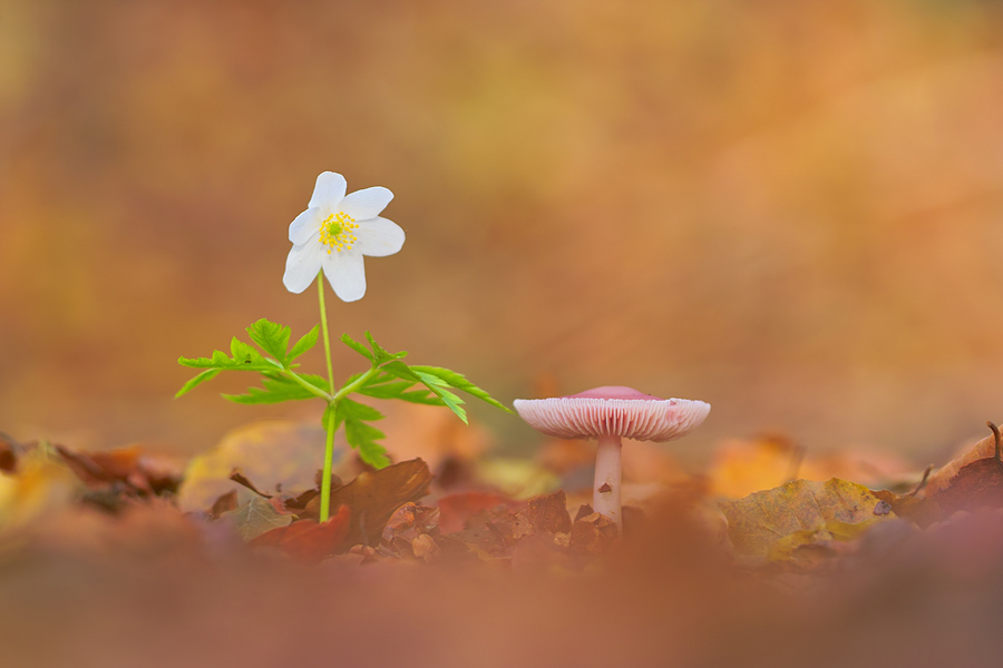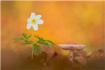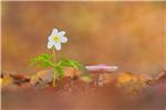 Buschwindröschen (Anemone nemorosa) mit Pilz im Herbstwald