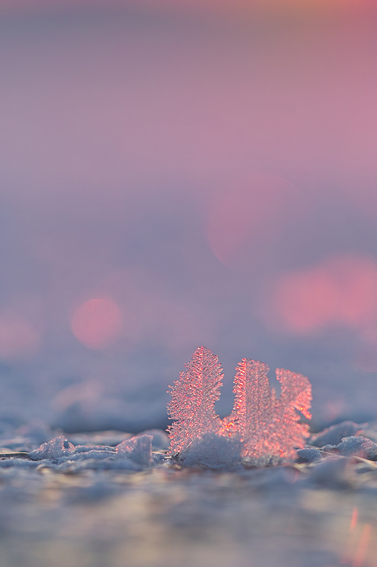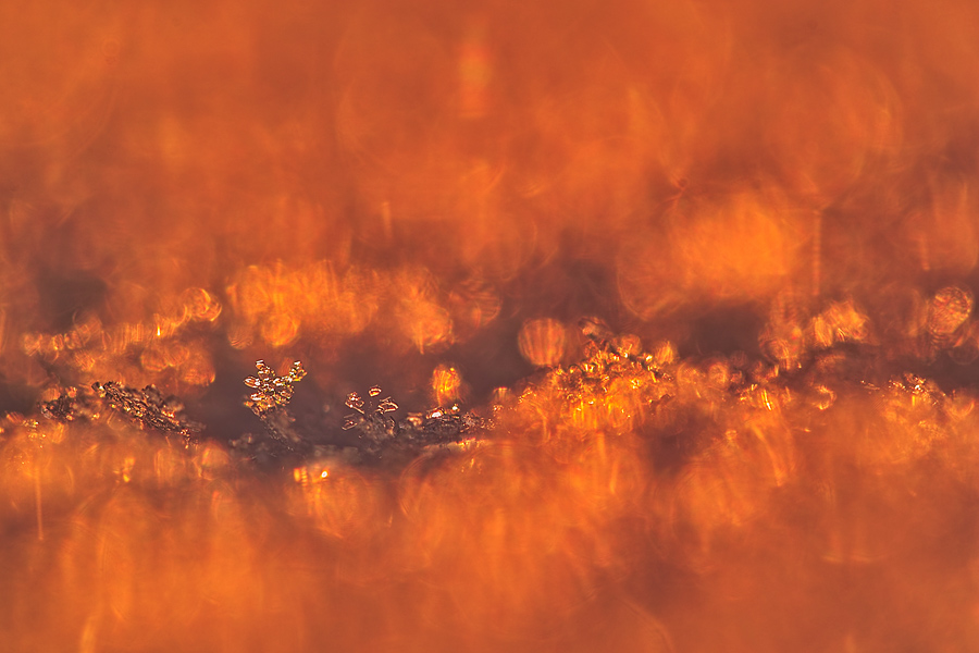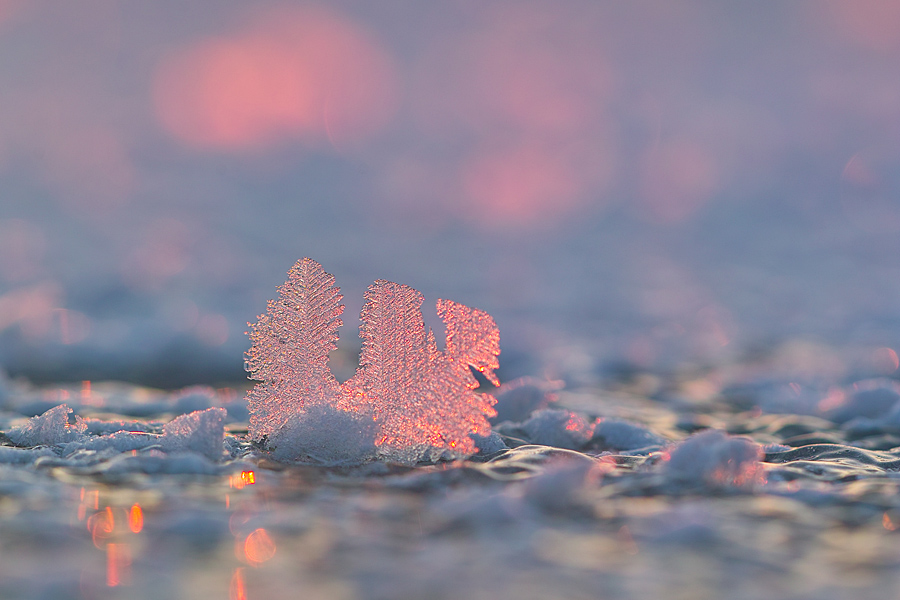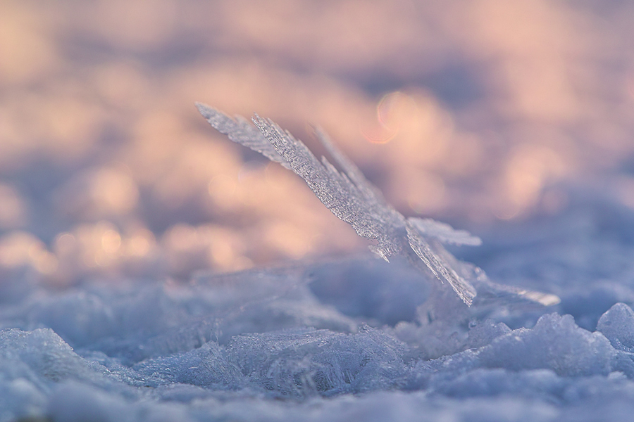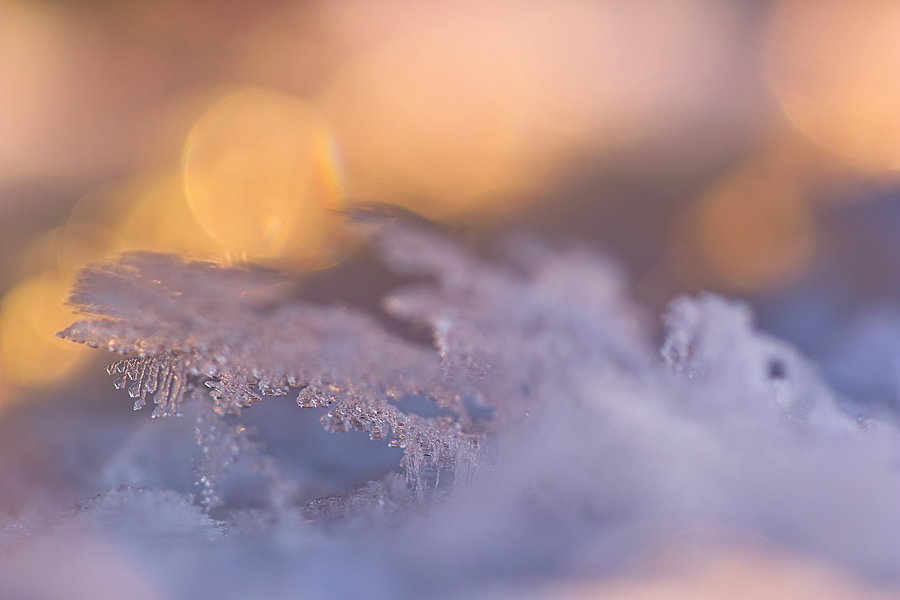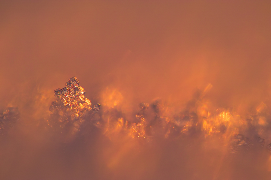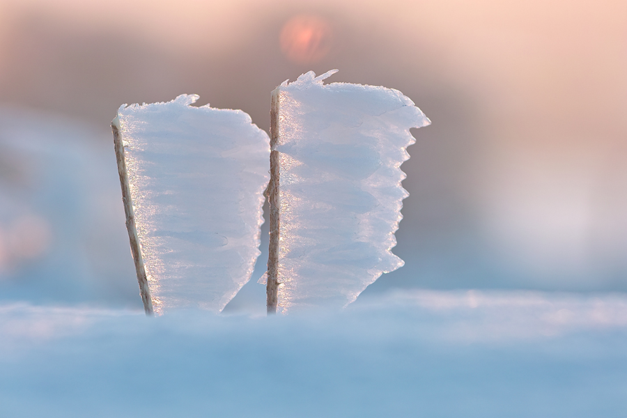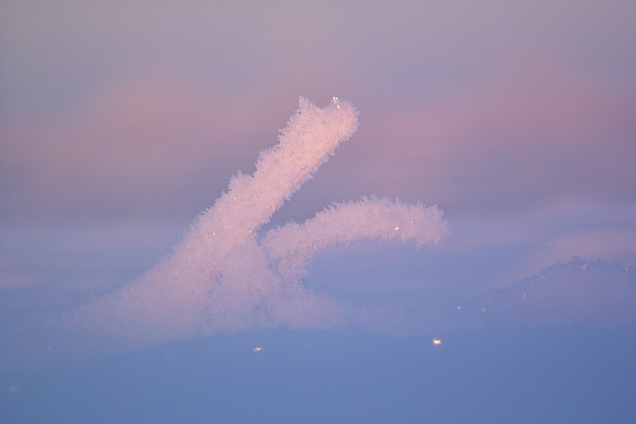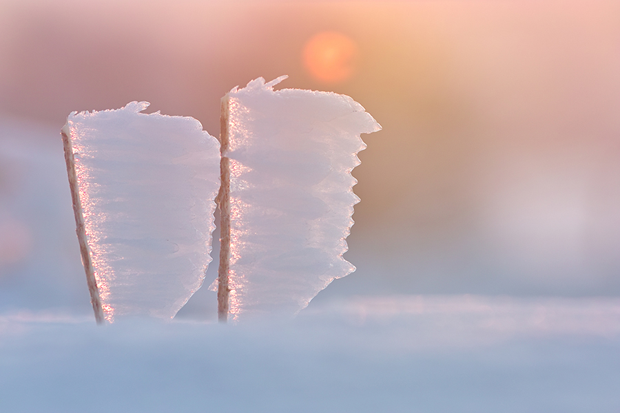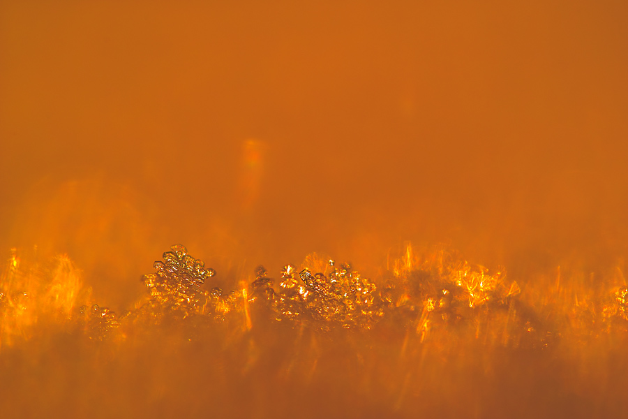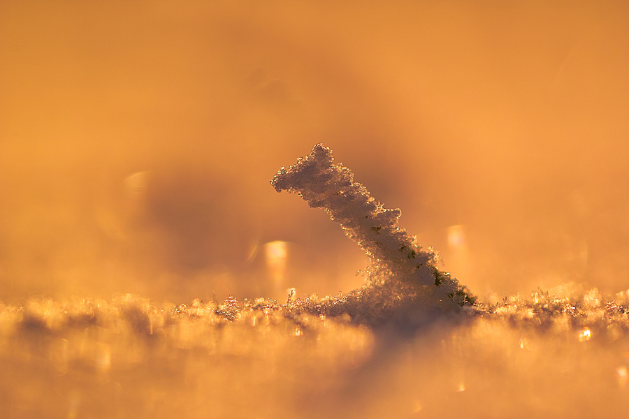 Oberflächenreif | Reifkristalle im Sonnenuntergangslicht